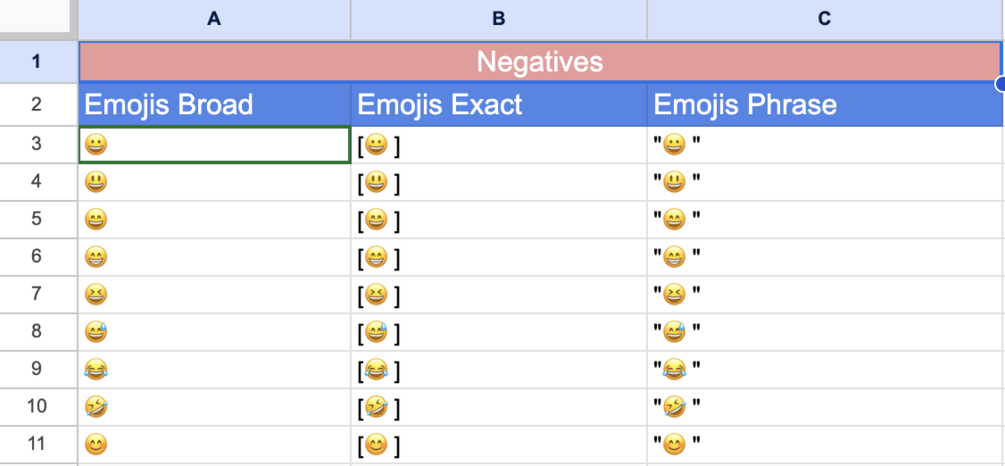 242 Emojis as Google Ads negative keywords in Broad, Phrase and Exact Match types.